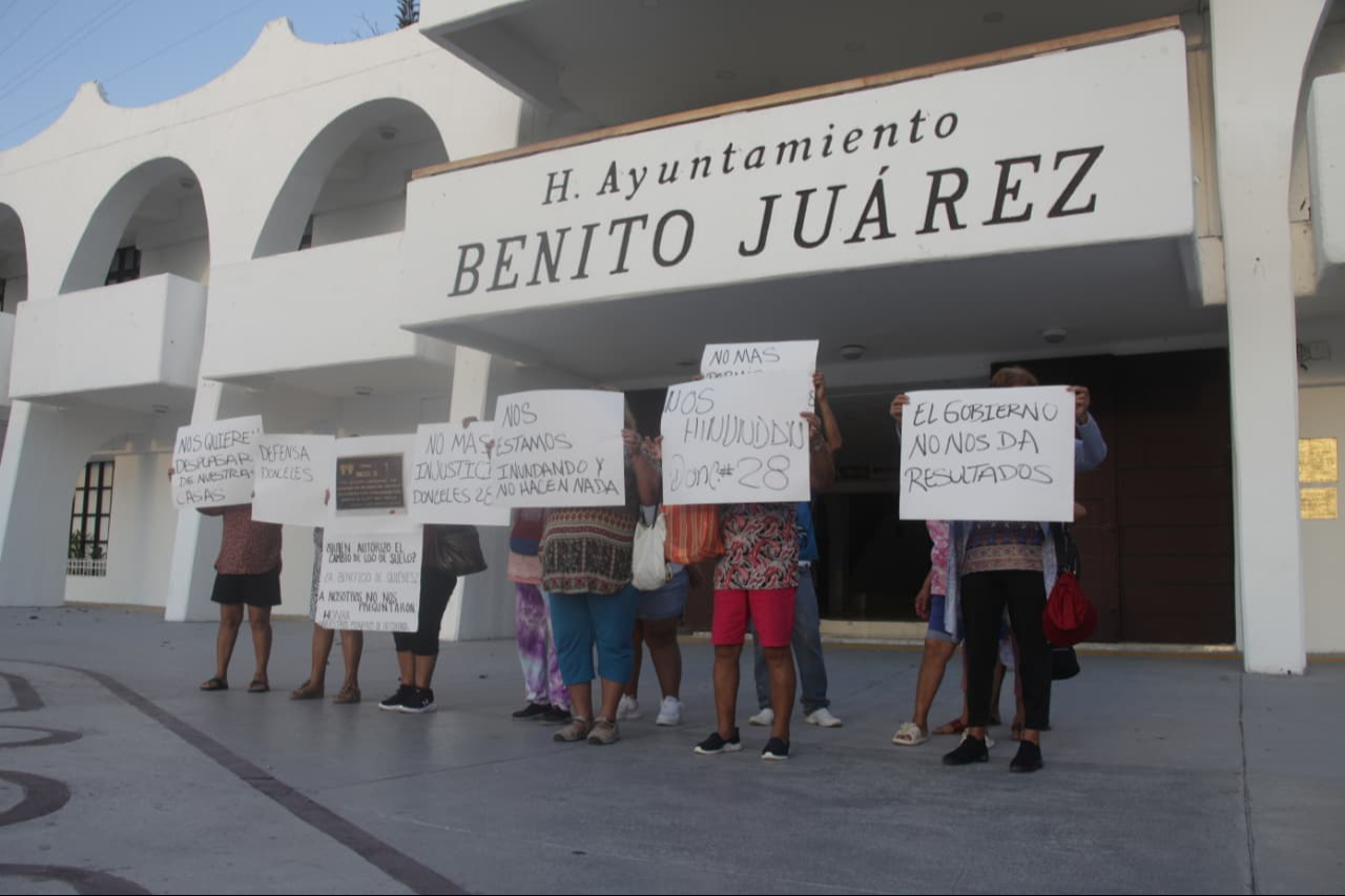 Un grupo de vecinos con carteles en mano exponiendo sus problemas en la colonia Donceles. "Nos inundamos con aguas negras porque el drenaje rebosa. En la calle Chichén Itzá, por el paso de camiones pesados que ingresan a Puerto Cancún el pavimento se rompió".