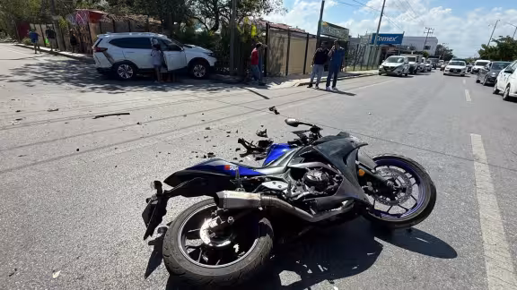 Un motociclista vivió prácticamente un milagro tras verse involucrado en un aparatoso accidente de tránsito registrado en el cruce de la avenida Constituyentes y la calle 85, en la colonia Ejidal. De acuerdo con los primeros reportes, el percance ocurrió cuando una camioneta particular Honda CR-V de color blanco no respetó el disco de alto ubicado en el cruce de camellones, provocando la colisión con la unidad de dos ruedas.