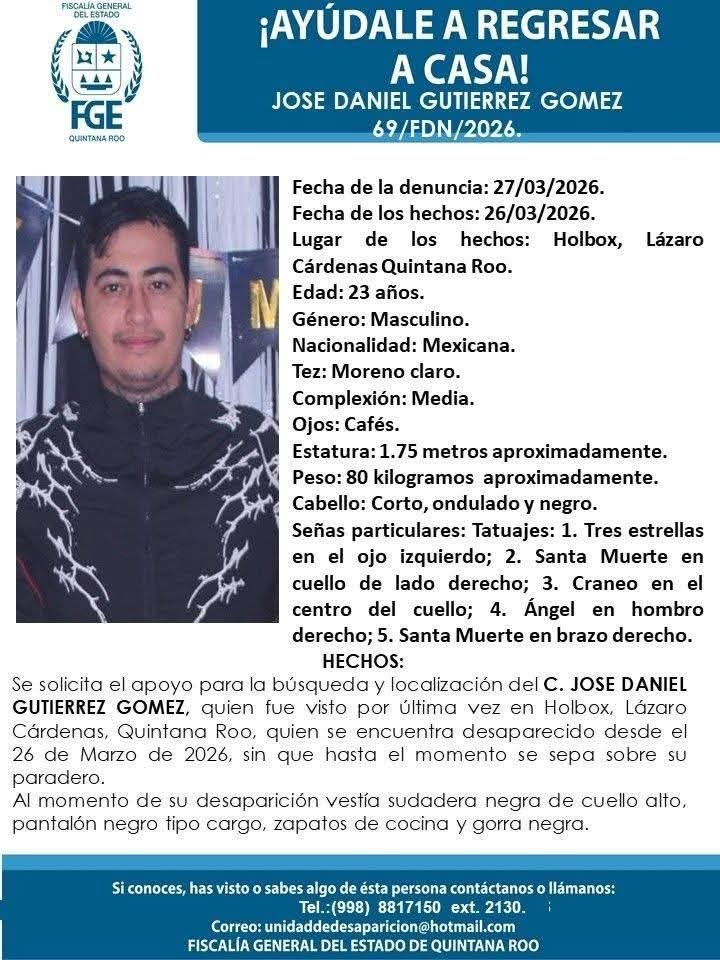Pese a estas declaraciones, las investigaciones ministeriales sostienen que el último contacto confirmado con José Daniel ocurrió precisamente dentro de la geografía de Holbox. El hoy ausente es de nacionalidad mexicana, mide aproximadamente 1.75 metros, pesa cerca de 80 kilogramos y es de tez moreno claro.