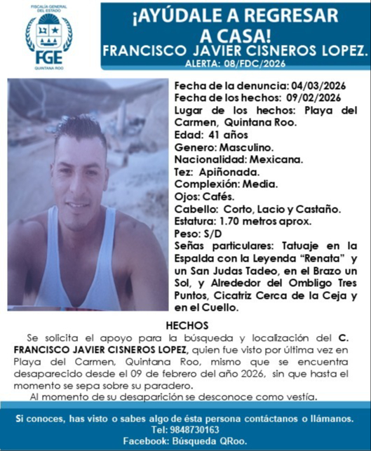 La desaparición de un hombre de 41 años reportada en Playa del Carmen activó una ficha de búsqueda para su localización. La Fiscalía General del Estado de Quintana Roo emitió la alerta 08/FDC/2026 para localizar a Francisco Javier Cisneros López, quien fue visto por última vez el 9 de febrero de 2026 en este municipio.
