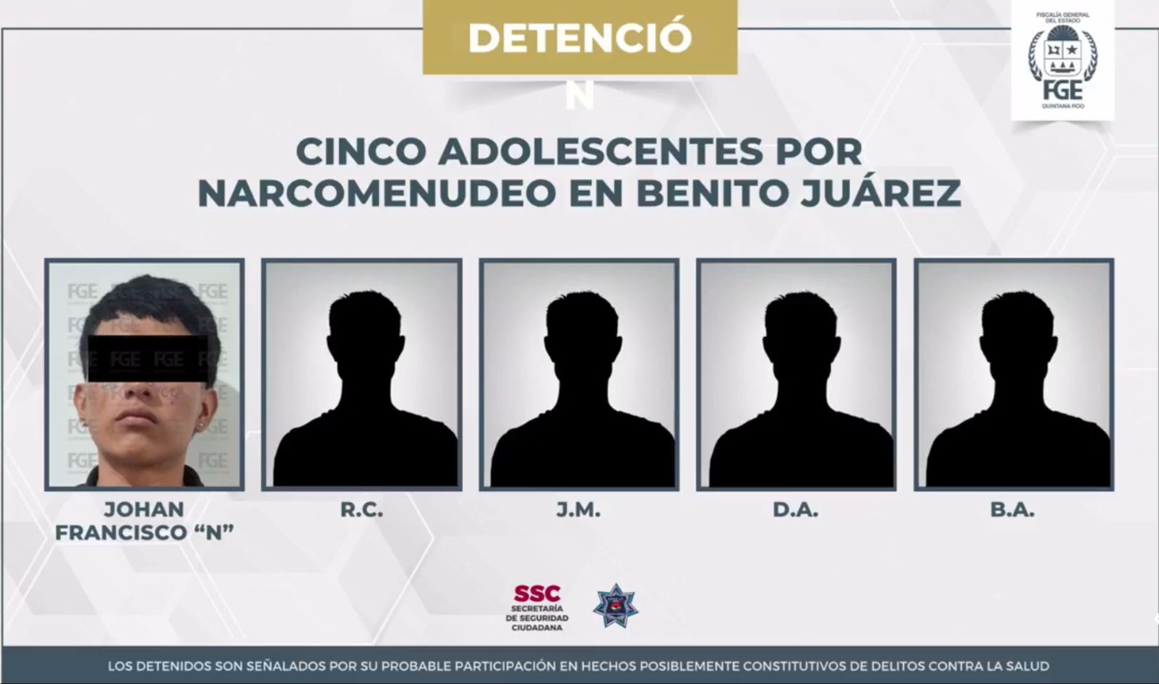 En ese lugar fueron detenidas cinco personas, quienes al momento del aseguramiento se encontraban presuntamente en posesión de diversas dosis de droga. Entre los detenidos se encuentra Johan Francisco “N”, de 19 años de edad y originario de Quintana Roo, así como cuatro menores identificados como Roberto Carlos “N”, de 17 años, originario de Tabasco; Jesús Martín “N”, de 16 años; Daniel Alejandro “N”, de 15 años; y Brandon Alonso “N”, también de 15 años, estos últimos originarios de Quintana Roo.