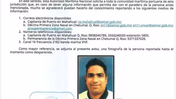 Con fundamento en la Ley de Navegación y Comercio Marítimos, la Secretaría de Marina (SEMAR) y la Capitanía de Puerto han puesto a disposición diversos canales para recibir cualquier información que coadyuve con el paradero de Poovathoor: