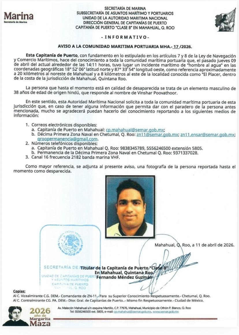 Con fundamento en la Ley de Navegación y Comercio Marítimos, la Secretaría de Marina (SEMAR) y la Capitanía de Puerto han puesto a disposición diversos canales para recibir cualquier información que coadyuve con el paradero de Poovathoor: