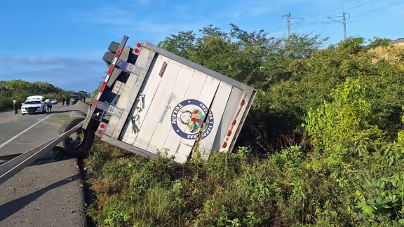 Chofer de un trailer cargado con varias toneladas de frutas y verduras, dormitó unos segundos y terminó volcado fuera de la carretera 307 y de manera milagrosa salva la vida al terminar seriamente dañado su unidad.