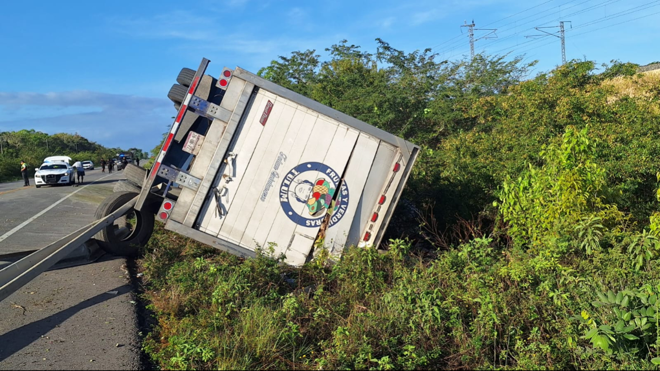Chofer de un trailer cargado con varias toneladas de frutas y verduras, dormitó unos segundos y terminó volcado fuera de la carretera 307 y de manera milagrosa salva la vida al terminar seriamente dañado su unidad.