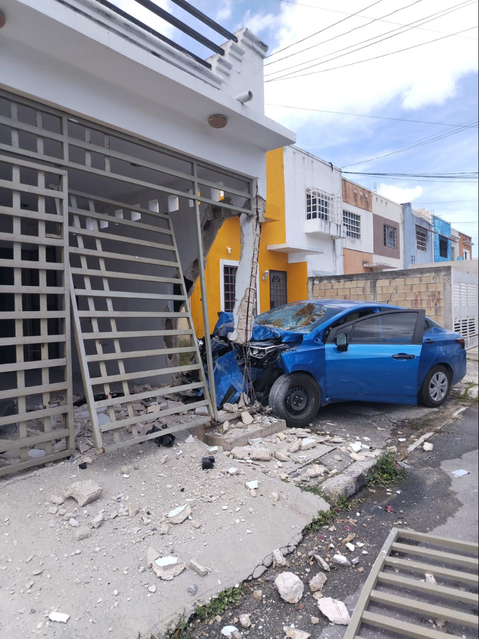 Los hechos ocurrieron alrededor de las 17:30 horas, sobre la calle Puerto de Veracruz con avenida Andalucía, en la Supermanzana 525. De acuerdo con los primeros reportes, el conductor de un vehículo Nissan Versa, color azul, circulaba presuntamente a exceso de velocidad. Al realizar una maniobra perdió el control de la unidad y se impactó contra el muro de un domicilio, derribando parte de la estructura y la reja.