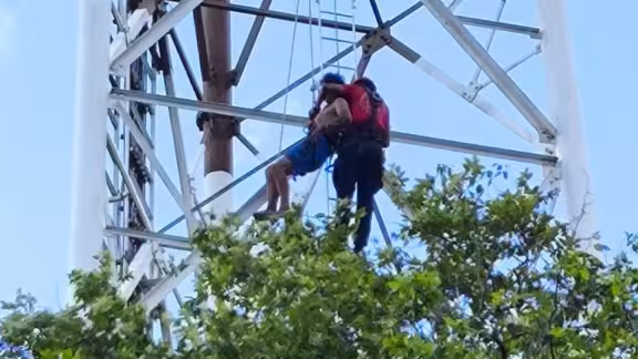 Vecinos reportaron alrededor de las 4:30 de la tarde que el sujeto se encontraba balanceándose a media torre, cuya altura supera los 30 metros.