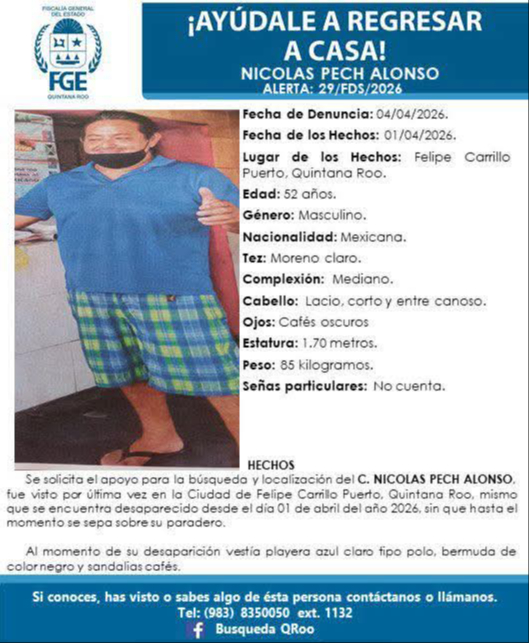 De acuerdo a información dada a conocer por la Fiscalía General del Estado, a través de la Comisión de Búsqueda de personas desaparecidas en Quintana Roo, refirió que en las ultimas horas fue activada una ficha de búsqueda, marcada con el número 29/FDS/2026 en agravio de Nicolas Pech Alonso de 52 años de edad, originario de Felipe Carrillo Puerto y que los hechos se registraron en esta ciudad.