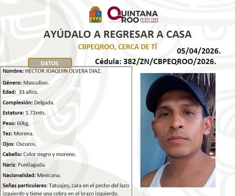 La Comisión de Búsqueda de Personas del Estado de Quintana Roo (CBPEQROO) activó esta tarde los protocolos de localización tras reportarse la desaparición de Héctor Joaquín Olvera Díaz, de 33 años, quien fue visto por última vez en este municipio el sábado 4 de abril.