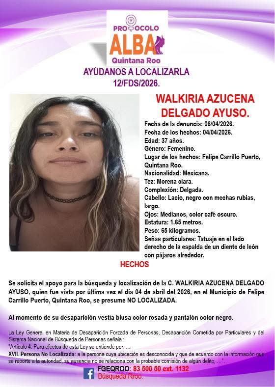 De acuerdo a información que se pudo indagar con autoridades policiales, se supo que en las últimas horas fue activada la ficha de búsqueda marcada con el número 12/FDS/2026, en agravio de Walkiria Azucena Delgado Ayuso de 37 años de edad, cuyos hechos se registraron el pasado 4 de abril en la ciudad de Felipe Carrillo Puerto.
