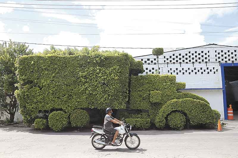 Para recordar el camión Kingwort T-300 de 21 toneladas, que manejó durante 53 años, don Pablo Andrés Becerril decidió darle esa forma a cuatro árboles de laurel que se encuentran a las puertas de la bodega de su empresa “Transportes Becerril”.