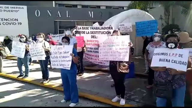 Esta mañana personal médico del Hospital Regional de Mérida del ISSSTE “Elvia Carrillo Puerto” se manifestó para exigir la renuncia del director doctor Paulo Flores Salazar y de la subdirectora administrativa, Mariana Fernández Mena y la Coordinadora de Enfermería, Rosa González Escamilla.