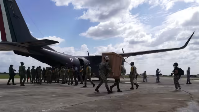 La Fuerza Aérea Mexicana realizó el traslado de 1.5 toneladas de insumos médicos para el tratamiento de personas con COVID-19 a las instalaciones de la Base Aérea Militar Número 8 de Mérida.