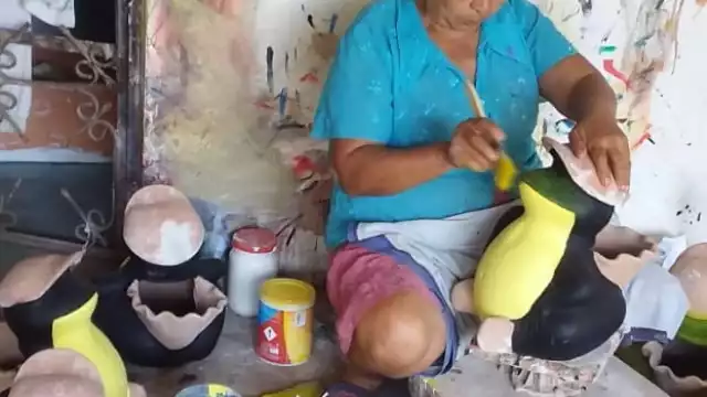 Por su parte, Lourdes Socoro Ayala Cach apoya a su hermano pintando las piezas que elabora, pues para no atrasarse, él elabora las piezas, las hornea y luego ella les da el acabado y color, diseña dándoles un toque especial.