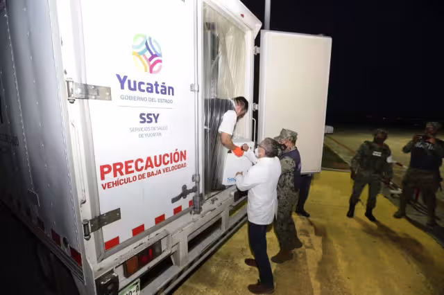 En representación del Gobernador Mauricio Vila Dosal, el subdirector de Salud Pública de la Secretaría de Salud del estado (SSY), Carlos Isaac Hernández Fuentes, acudió a la Base Aérea Militar (BAM) Número 8 para supervisar el arribo de este cargamento, que llegó en una aeronave Hércules con matrícula FAM 3616, proveniente de la Ciudad de México, la cual aterrizó a las 19:28 horas.