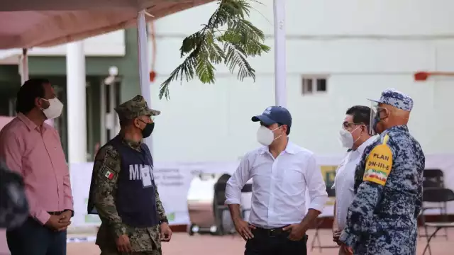 Acompañado del coordinador Estatal para la Vacunación Covid-19, capitán de Corbeta Carlos Gómez Montes de Oca y del comandante de la Base Aérea Militar Número 8, General de Ala Piloto Aviador Juan Ángel Jardón Aguilar, Vila Dosal verificó la preparación de este Colegio, así como la operatividad de las áreas que conforman este proceso, que son registro, triage, vacunación y recuperación, todo con el fin de corroborar que el procedimiento se lleve a cabo de forma ágil y en orden.