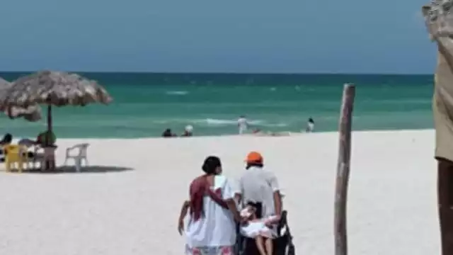 De acuerdo con la información recabada, la fotografía fue tomada en la playa de Sisal. En ella se observa a una pareja de adultos mayores llevando a una menor con discapacidad motriz a la playa.