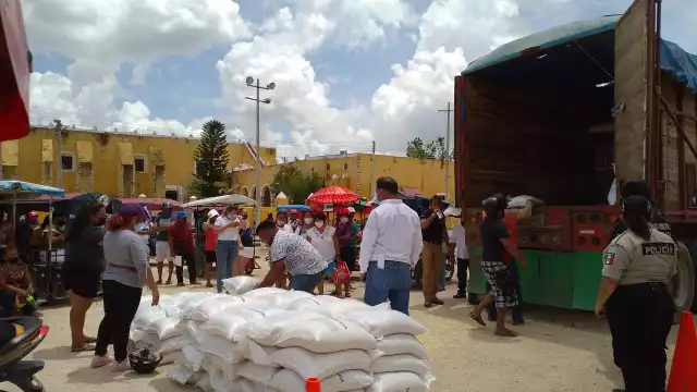Ayer, alrededor de las 11:00 horas, en la explanada del centro, personas se arremolinaron para que les hicieran la entrega de apoyos, que consistía en un bulto de maíz de 20 kilogramos por parte del Gobierno del Estado.