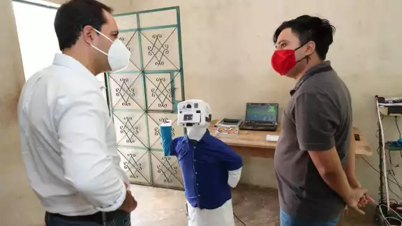 El Gobernador de Yucatán estuvo en la casa de William Ortiz Noh, estudiante de ingeniería mecatrónica en la Universidad Tecnológica Metropolitana que inventó un robot usando un software básico y a partir de teléfonos celulares antiguos toma la temperatura, sirve gel antibacterial y cuenta bombas, chistes y dice palabras en maya.
