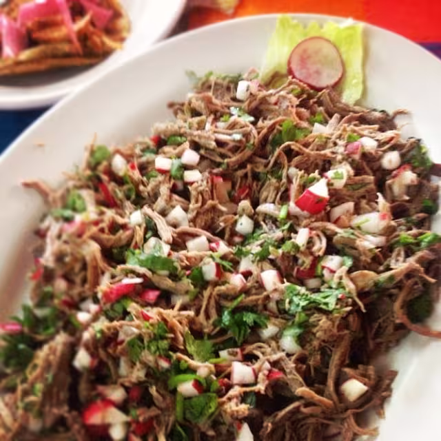 Es un platillo preparado, como su nombre lo dice, a base de carne de venado deshebrada y sazonada con sal, jugo de naranja agria, rábano, cilantro, cebolla y chile habanero.