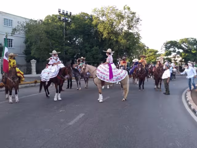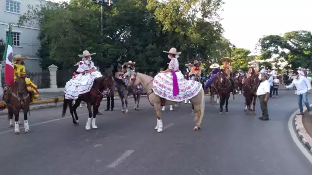 La Unión de Asociaciones de Charros de Yucatán convocó a este evento que se realiza en el Monumento a la Patria. Al sonido de un mariachi, varios binomios, caballo y jinetes, hacen el recorrido hasta el Monumento a Felipe Carrillo Puerto y posteriormente harán la entrada floral en los pies de la obra del escultor Rómulo Rozo.