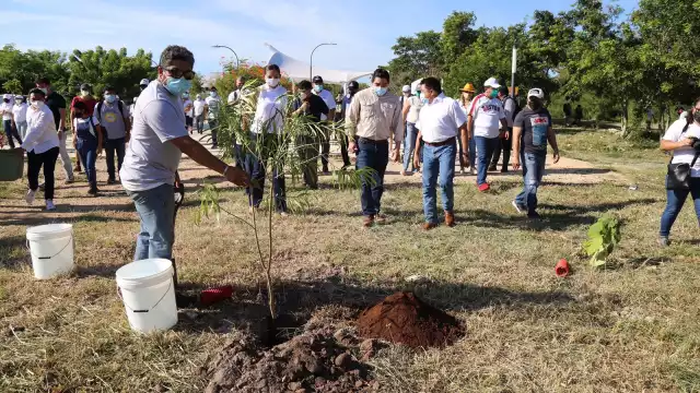 El titular de la Codhey, Miguel Óscar Sabido Santana, explicó que la meta del día es plantar al menos 100 ejemplares de distintas especies locales como ceibas y baches, mediante la participación activa del personal del organismo que encabeza.
