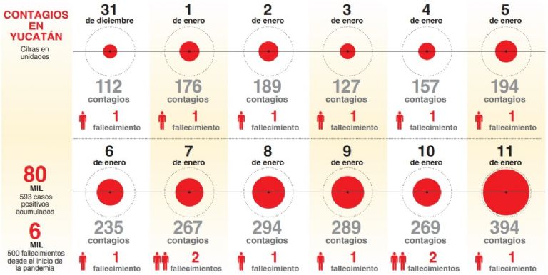 De los 80 mil 593 casos positivos, 654 son de otro país u otro estado. En Mérida se han diagnosticado 48 mil 860 personas contagiadas de COVID-19 (acumulados al 10 de enero). En el parte médico, también se reportó el deceso de una mujer de 66 años de Mérida. En total, son 6 mil 500 las personas fallecidas a causa del coronavirus.