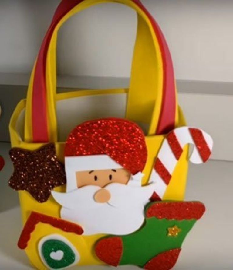 Lo único que necesitas es cortar una botella de refresco por la mitad y usar hojas de colores o foamis para decorarla, simulando que la botella es la barriga de Santa llena de dulces y chocolates.