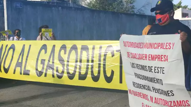 Entre pancartas vecinos San Damián y Residencial Pensiones etapa 6 y 7 se manifestaron en contra del gasoducto, pues aseguran que ninguno de estos tienen contrato con la empresa