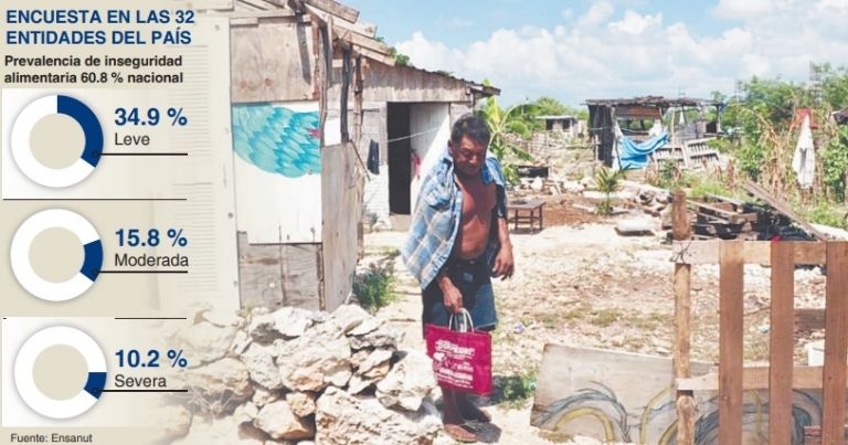 La encuesta se aplicó en 12 mil 520 hogares de las 32 Entidades, que representan a 36 millones 477 mil hogares del país. A nivel nacional, la prevalencia de inseguridad alimentaria, en cualquiera de sus condiciones, fue de 60.8 por ciento: 34.9 por ciento en leve, 15.8 por ciento en moderada y 10.1 por ciento en severa, afectando con mayor intensidad a la población que habita en localidades rurales.