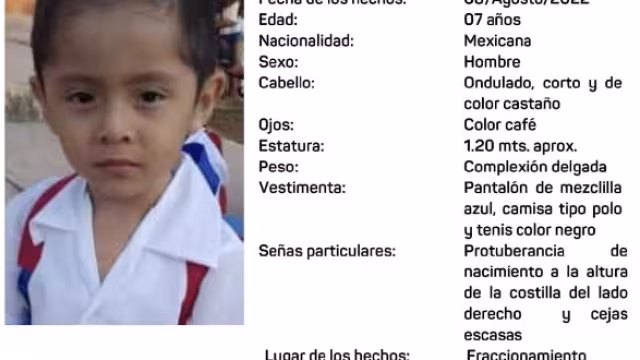 El niño lleva varios días desaparecido, siendo visto usando un pantalón de mezclilla color azul,  camisa tipo polo y tenis de color negro, color de ojos café, su peso es de complexión delgada y mide aproximadamente 1.20 metros