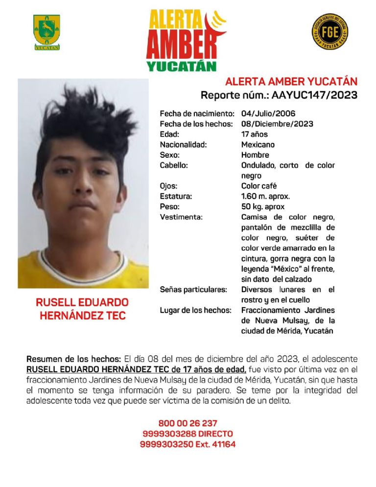 Un joven, identificado como Russell Eduardo Hernández Tec, se encuentra desaparecido, por lo que la FGE Yucatán activó la Alerta Amberpara su búsqueda y localización.