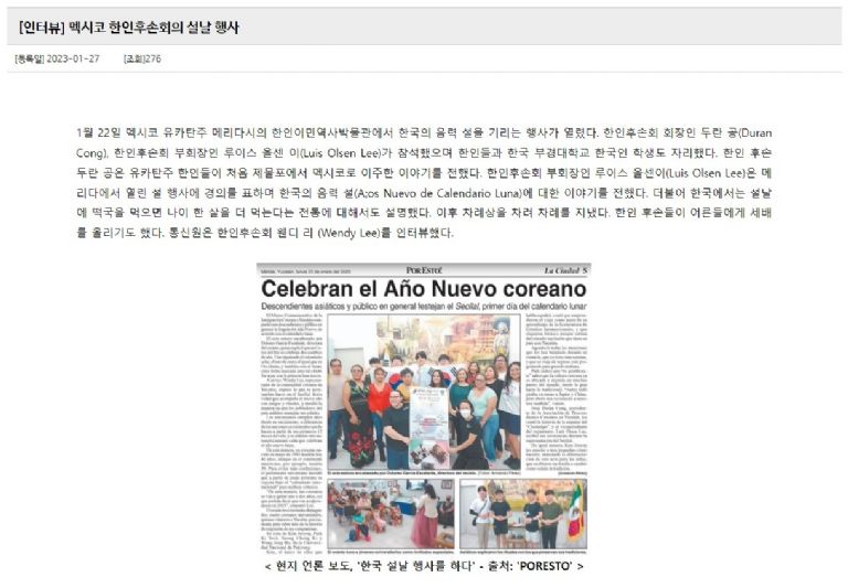 Con el título “Evento de Año Nuevo de los Descendientes Coreanos de México”, Seong-bin explicó como los yucatecos conmemoraron el Seollal y resaltó a la Asociación de Descendientes Coreanos en Yucatán, presidida por Juan Durán Cong y Luis Olsen Lee.