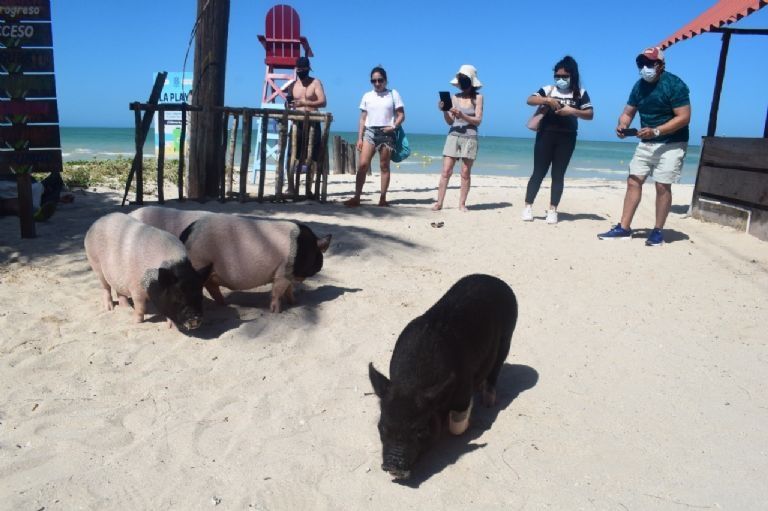La 'Pig Beach' se encuentra en Yucalpetén en el puerto de Progreso, donde turistas conviven con los cerditos, los cuales salen durante aproximadamente 30 minutos para pasear por la playa.