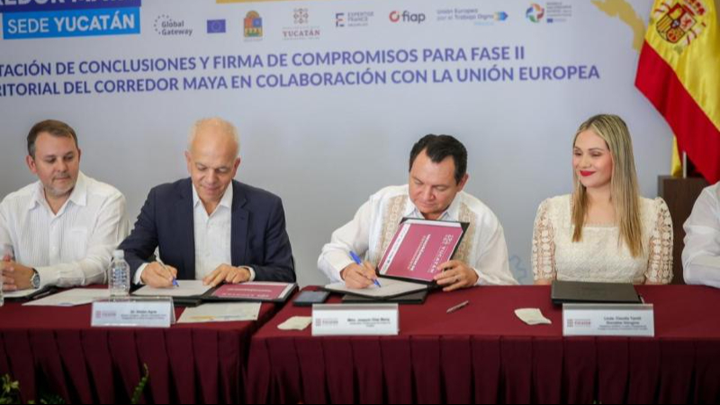 Durante la presentación de resultados de la mesa territorial del Corredor Maya, con sede en Yucatán, el gobernador Joaquín Díaz Mena y el ministro consejero y jefe de cooperación de la Delegación de la Unión Europea en México, Stefan Agne, firmaron el Memorándum de Entendimiento de los Compromisos para la fase II de esta colaboración.