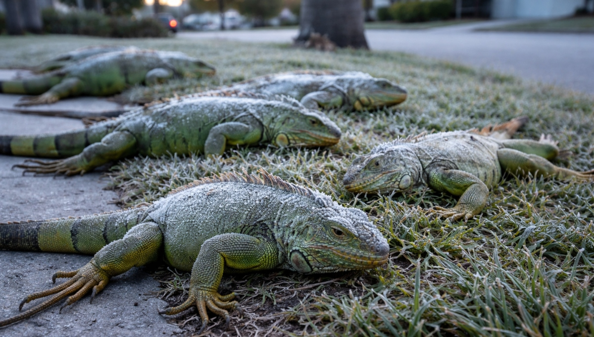 La prevalencia de la masa de aire ártico en dicho estado, ha generado una "lluvia" de iguanas verdes, consideradas invasoras, que caen de los árboles al no estar adaptadas a ese tipo de condiciones.