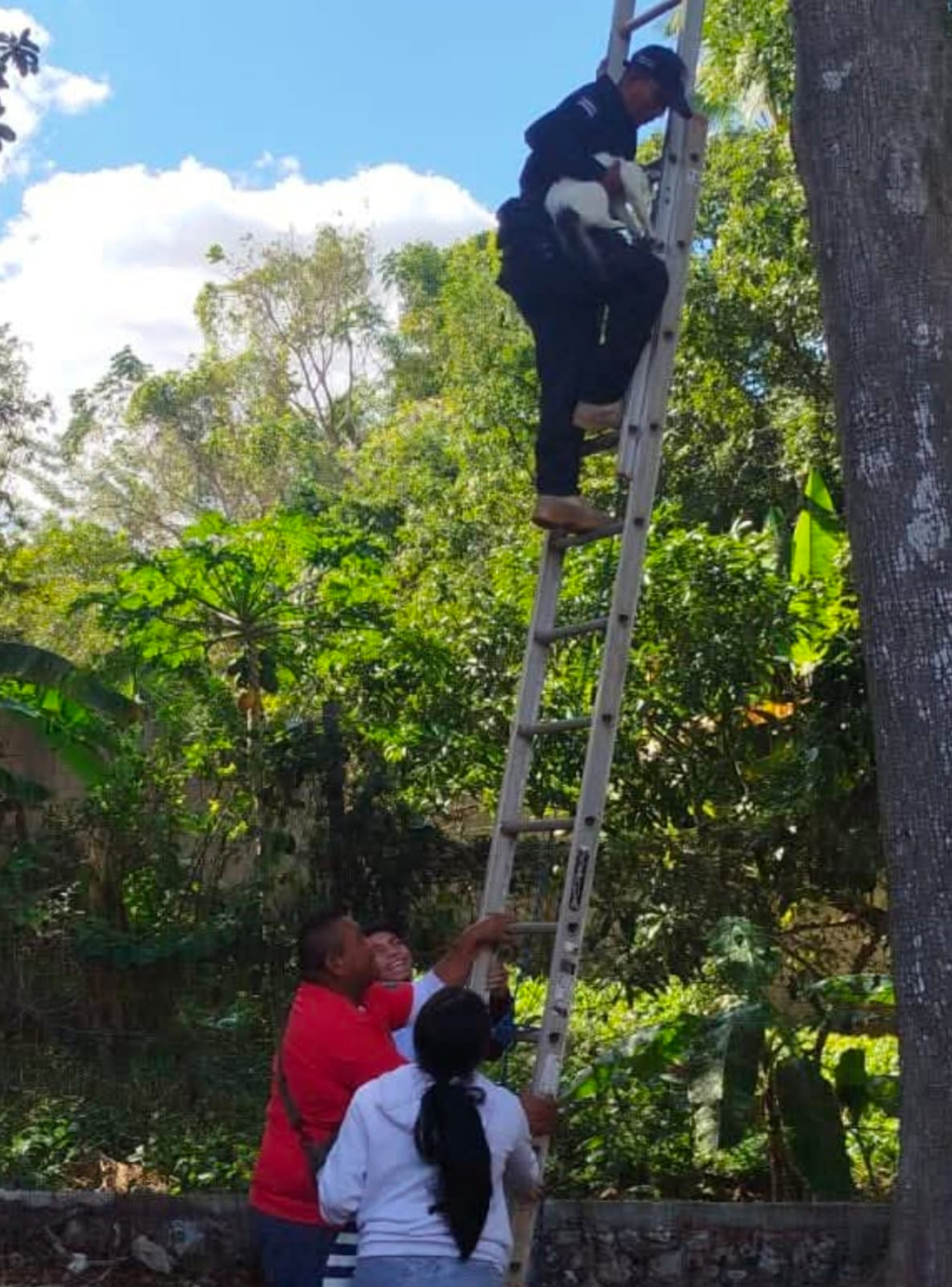 Elementos de la Policía Municipal y de Protección Civil atendieron de manera oportuna un reporte ciudadano relacionado con el rescate de un gatito que se encontraba atrapado en lo alto de un árbol de mamey, a una altura aproximada de 12 metros, situación que generó preocupación entre sus propietarios y vecinos de la zona.