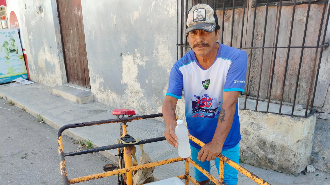 Durante la temporada de veda del mero rojo y el pulpo, el pescador Wilfrido Jiménez encontró en la venta de agua de coco una alternativa para sostener a su familia. Desde temprana hora recorre las calles de Hunucmá en su triciclo ofreciendo esta bebida natural, así como paletas heladas y dulces, productos que prepara con fruta que trae desde el puerto de Celestún.