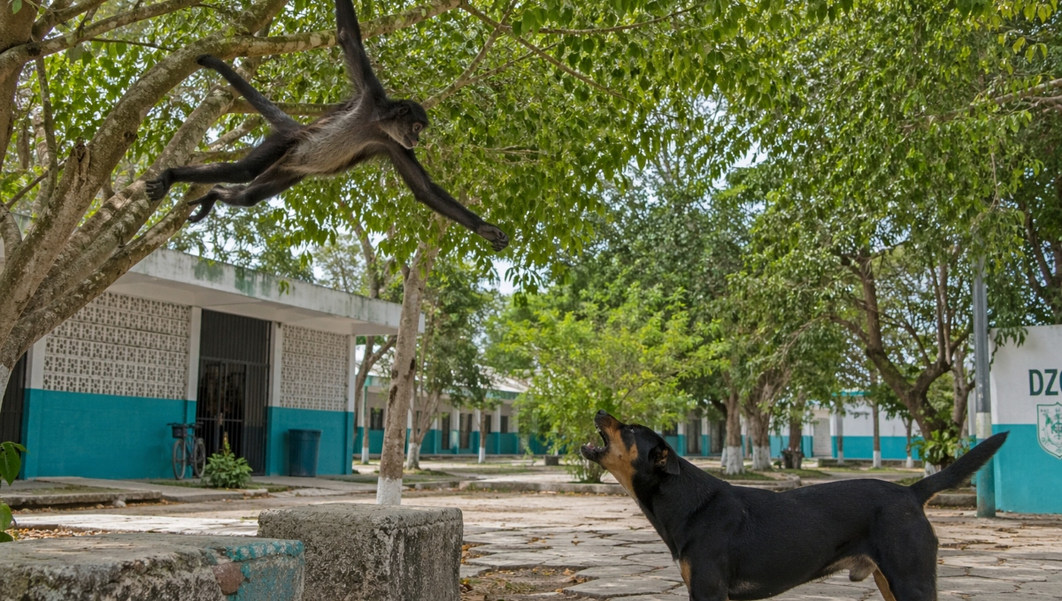 Mediante redes sociales, la institución compartió un extraordinario video, en donde se observa al primate balanceándose en un árbol, mientras Max, un perro adoptado por el bachillerato, le ladra y permanece atento a sus movimientos.