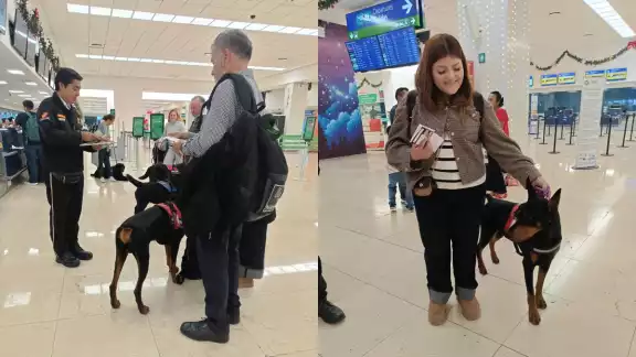 Tania, la única que hablaba español, explicó que apenas tiene un año de estar conviviendo con Baskin, con el que se siente muy segura y tranquila donde quiera que va, porque además de obediente, muestra un buen comportamiento, prueba de esto es que tanto él como los otros labradores se mostraron muy tranquilos durante su corto paso por la terminal de Mérida.
