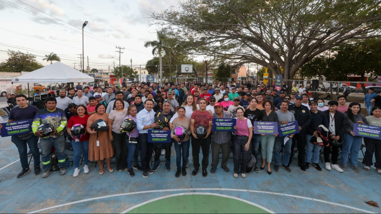 Un total de 175 repartidores, prestadores de servicios y personas autoempleadas recibieron cascos certificados DOT de manera gratuita, durante la primera entrega del año del programa municipal Chambea Seguro que impulsa el Ayuntamiento de Mérida.
