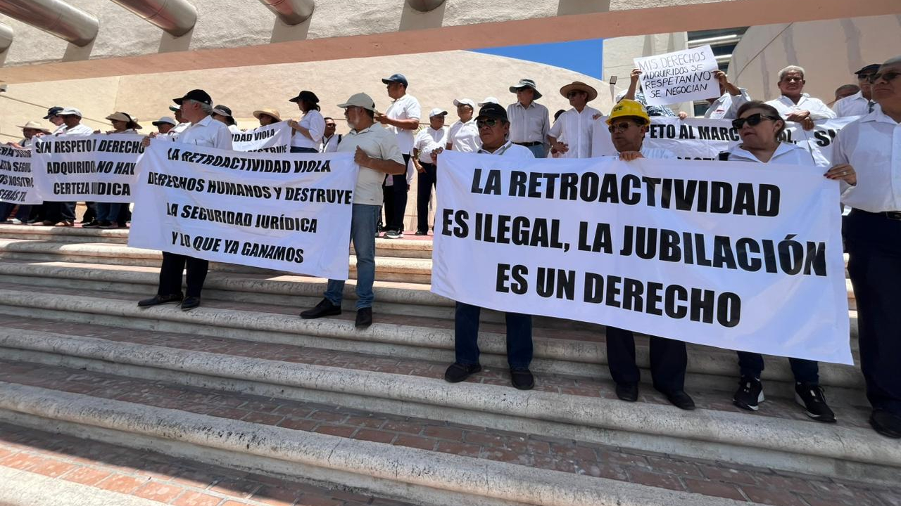 Durante la protesta, las y los manifestantes portan carteles con consignas como: “Sin certeza jurídica nadie está seguro, hoy somos nosotros, mañana serás tú” y “La retroactividad es ilegal, la jubilación es un derecho”.