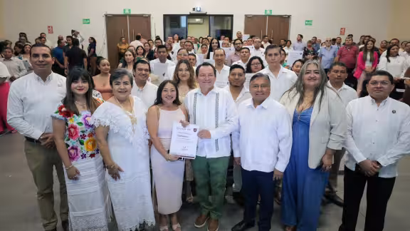 El gobernador Joaquín Díaz Mena entrega 64 nombramientos a trabajadores de apoyo educativo en Yucatán.