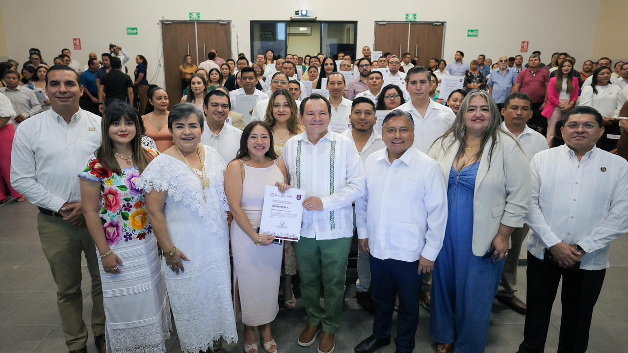 El gobernador Joaquín Díaz Mena entregó 64 plazas del proceso de admisión al servicio público educativo al Personal de Apoyo y Asistencia a la Educación (PAAE), con lo que se brinda certeza laboral, estabilidad y mejores condiciones de trabajo a personal adscrito a las oficinas centrales de la Secretaría de Educación del Estado de Yucatán (Segey).