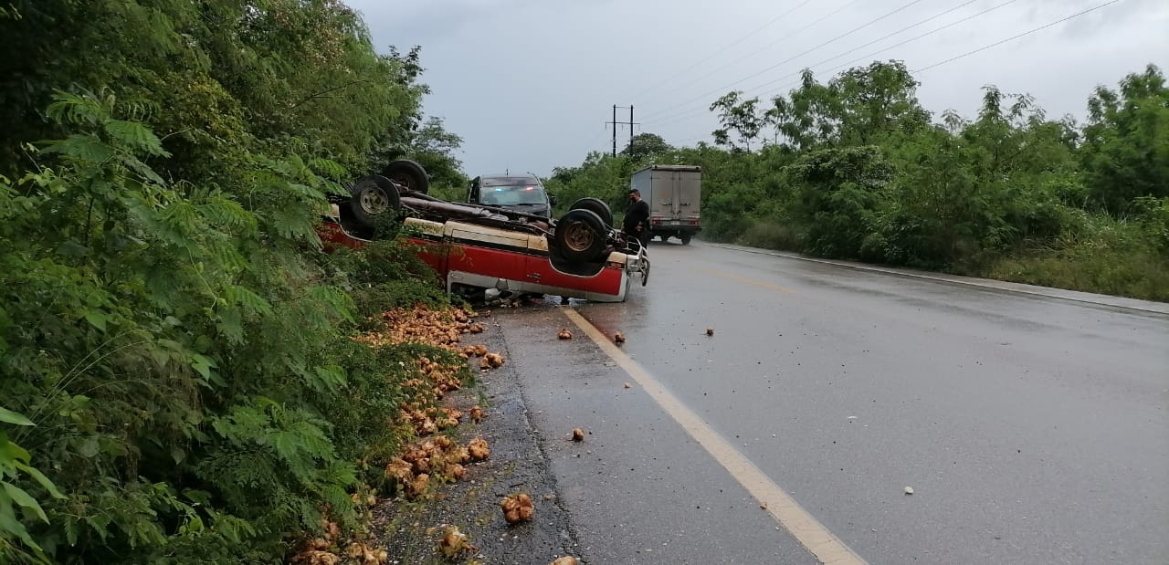 Según los hechos, la camioneta con placas de circulación YP-4709-A del estado de Yucatán cargada de jícamas transitaba de poniente a oriente en el tramo antes mencionados cuando el chofer perdió el control por el pavimento mojado, causando que este diera una volcadura para quedar con las llantas hacia arriba por suerte el chofer no sufrió lesiones mas que el susto.