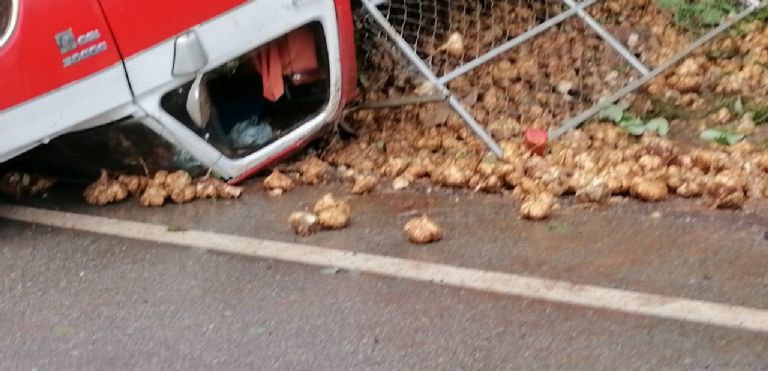 El pavimento mojado causó que un camioneta pierda control para volcarse, quedando con las llantas hacia arriba, donde por fortuna el chofer pudo salir sin ninguna lesión solo se registraron pérdidas materiales, de igual forma su cosecha de jícamas.