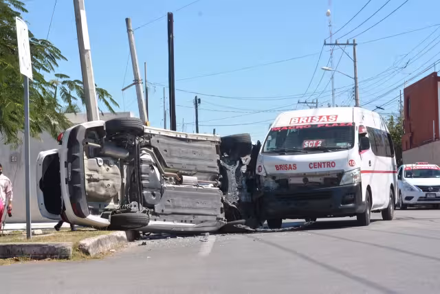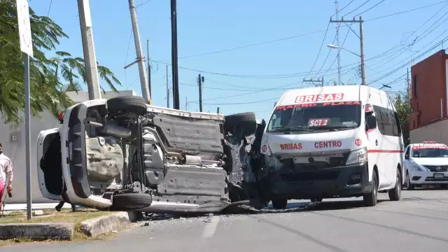Nueve lesionados leves, en una colisión y volcadura en el fraccionamiento Brisas, una camioneta Kia chocó a una combi habilitada como transporte público y se volcó.