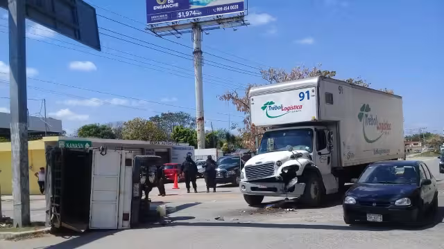 Camión provoca volcadura tras chocar con una camioneta en Kanasín