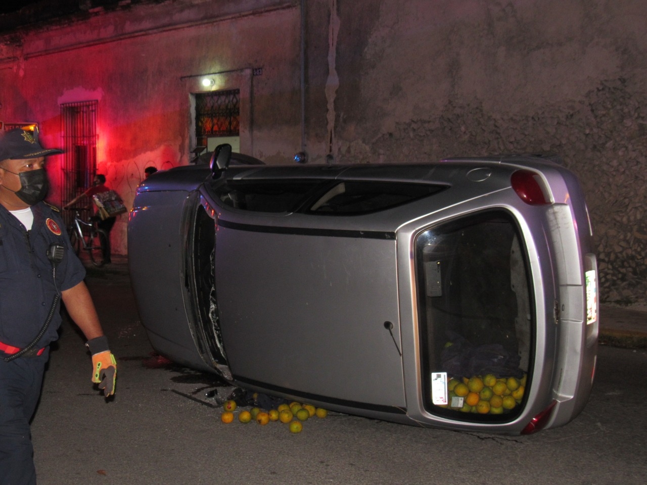 Una persona, al parecer en estado inconveniente, volcó su automóvil Chevy con placas DSF-96-54 del Estado de Campeche en el cruce de las calles 61 y 76 del segundo cuadro de la ciudad de Mérida.