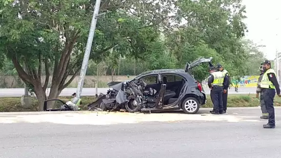 Los hechos ocurrieron cuando el conductor del automóvil March con placas de circulación YWA-071-C al bajar el puente del periférico en el kilómetro nueve, perdió el control del volante del automóvil, se salió de la cinta asfáltica y colisionó con la base de un poste del alumbrado público.
